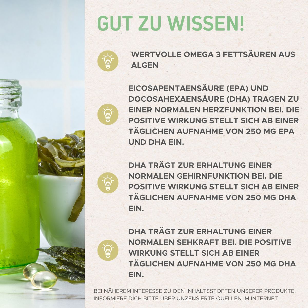 Zutaten: Algenölmischung (life´s®OMEGA 1) (72,5 %) (DHA- und EPA-reiches Öl aus der Mikroalge Schizochytrium sp., Sonnenblumenöl, Antioxidationsmittel (Salvia rosmarinus (Rosmarin) Blätter Extrakt, stark tocopherolhaltige Extrakte, L-Ascorbylpalmitat)), Kapselhülle (modifizierte Stärke, Feuchthaltemittel (Glycerin), Geliermittel (Carrageen), Säureregulator (Natriumcarbonat)).