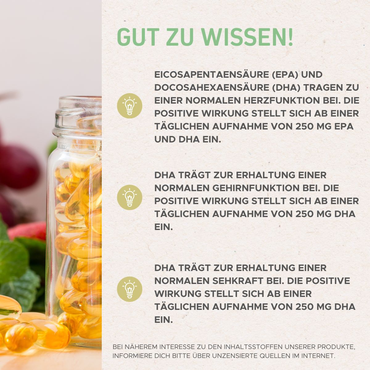 * Eicosapentaensäure (EPA) und Docosahexaensäure (DHA) tragen zu einer normalen Herzfunktion bei. DHA trägt zur Erhaltung einer normalen Gehirnfunktion und einer normalen Sehkraft bei. Die positive Wirkung stellt sich ab einer täglichen Aufnahme von 250 mg EPA und DHA ein.