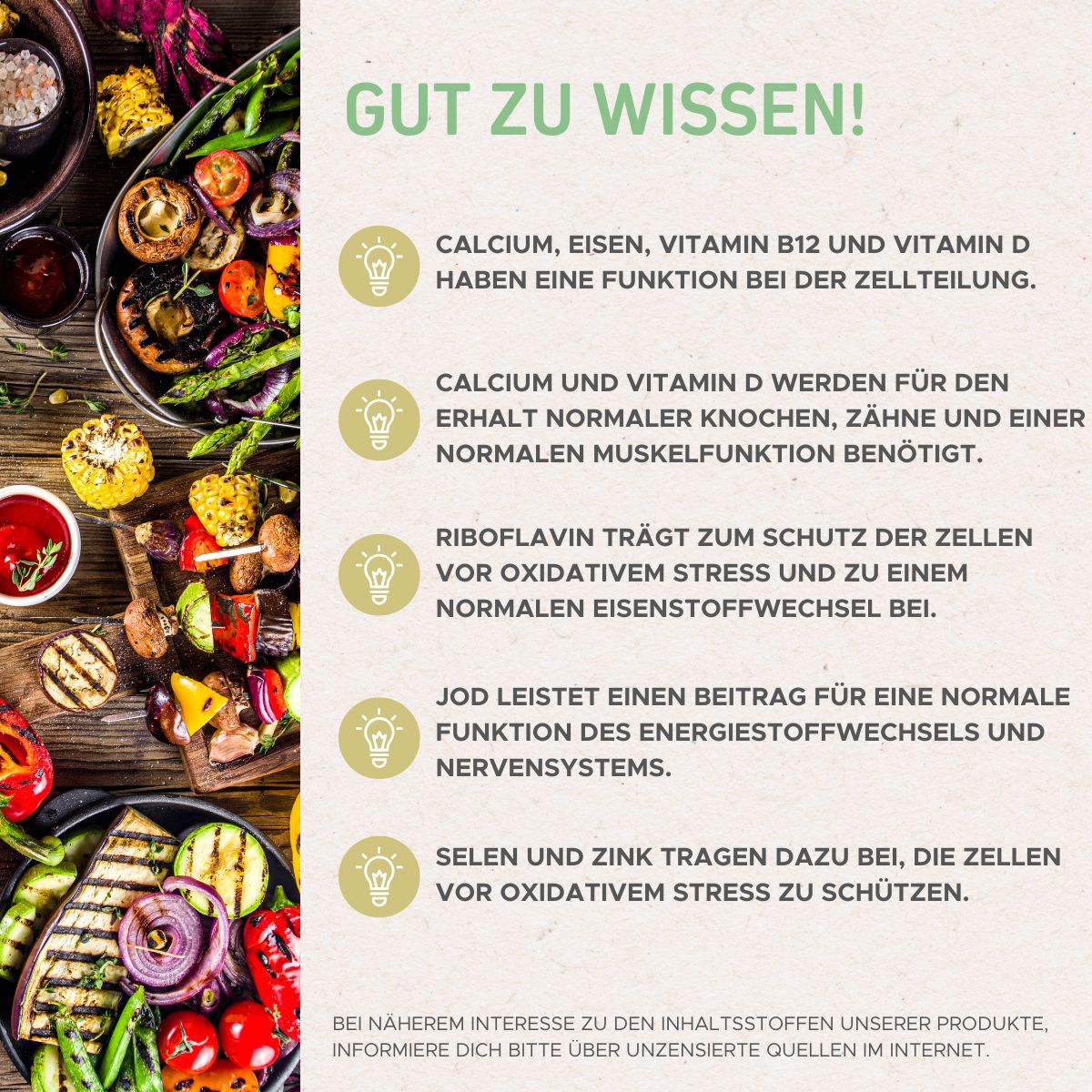 Die Rezeptur setzt sich aus den wertvollen Mineralstoffen Calcium, Zink, Eisen, Jod und Selen zusammen und enthält mit Vitamin B12, Riboflavin und Vitamin D gleichermaßen die wertvollen Vitamine für Veganer und Vegetarier, die der Körper dringend benötigt.