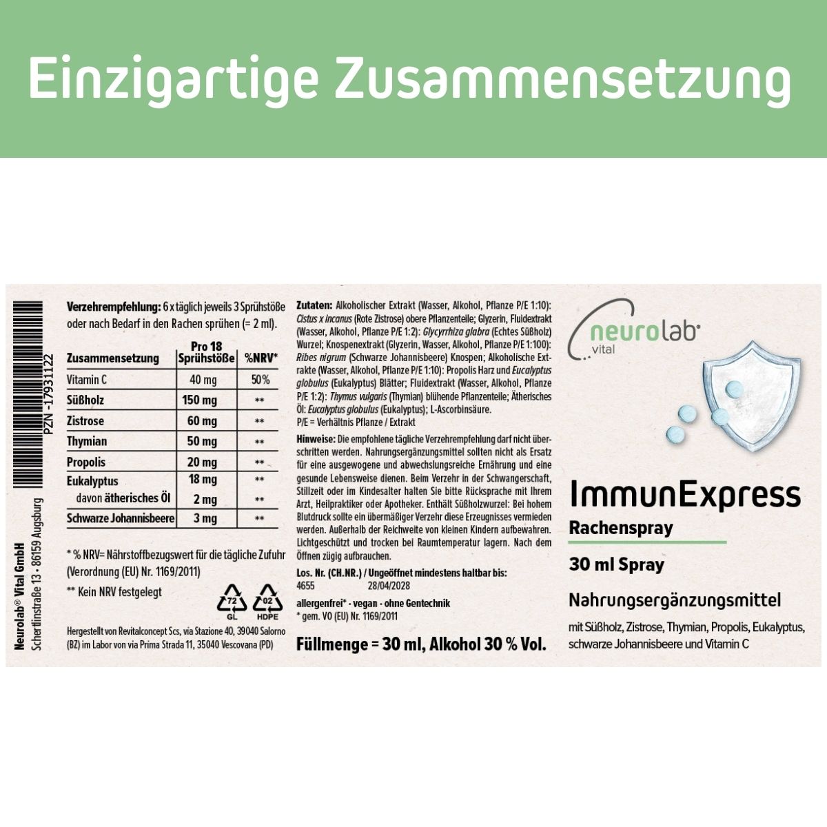 Zutaten: Alkoholischer Extrakt (Wasser, Alkohol, Pflanze P/E 1:10): Cistus x incanus (Rote Zistrose) obere Pflanzenteile; Glyzerin, Fluidextrakt (Wasser, Alkohol, Pflanze P/E 1:2): Glycyrrhiza glabra (Echtes Süßholz) Wurzel; Knospenextrakt (Glyzerin, Wasser, Alkohol, Pflanze P/E 1:100): Ribes nigrum (Schwarze Johannisbeere) Knospen; Alkoholische Extrakte (Wasser, Alkohol, Pflanze P/E 1:10): Propolis Harz und Eucalyptus globulus (Eukalyptus) Blätter; Fluidextrakt (Wasser, Alkohol, Pflanze P/E 1:2): Thymus vulgaris (Thymian) blühende Pflanzenteile; Ätherisches Öl: Eucalyptus globulus (Eukalyptus); L-Ascorbinsäure.
